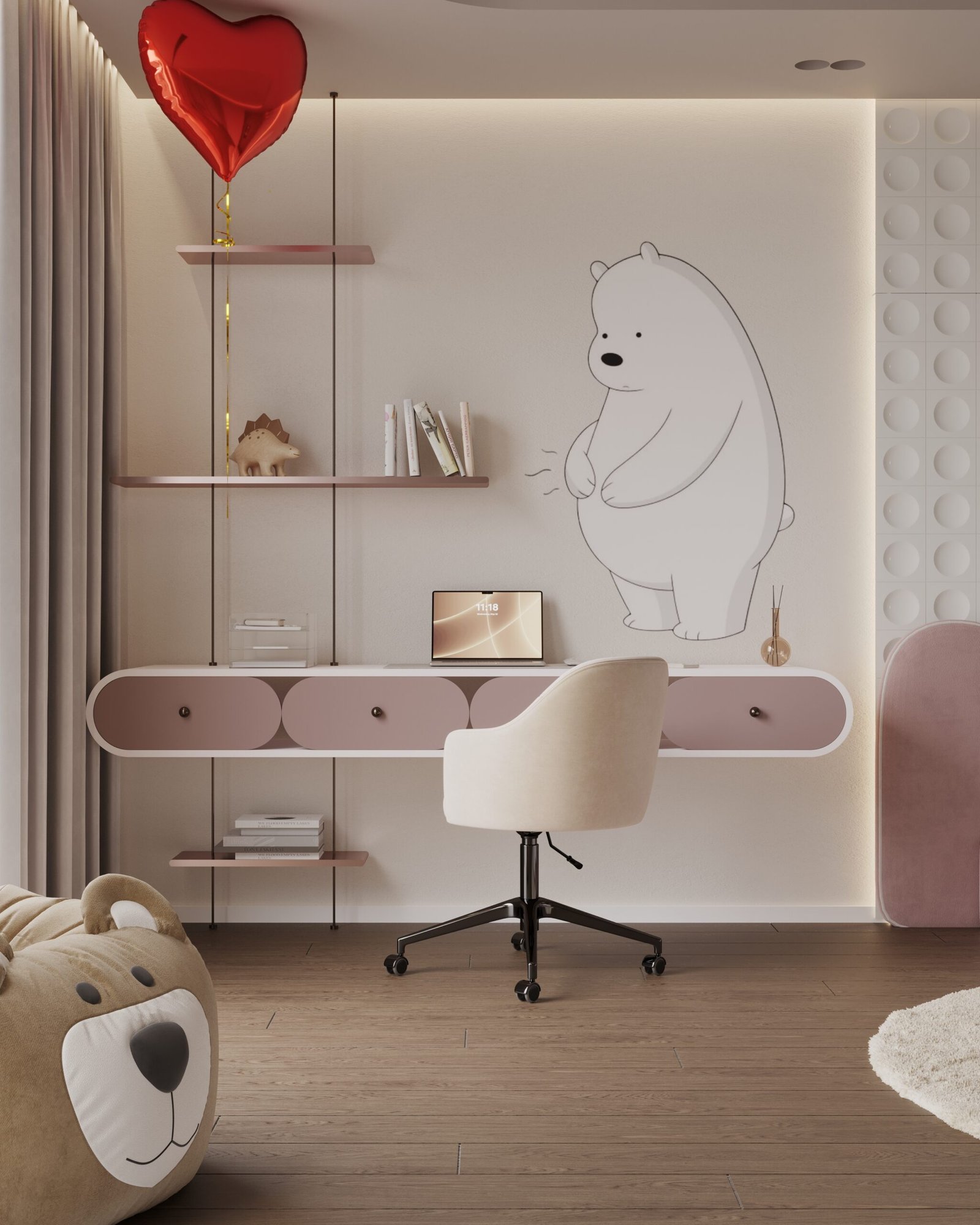 W tym projekcie dziecięcego pokoju postawiliśmy na delikatną, dziewczęcą paletę – subtelny róż zestawiono z kremowymi dodatkami oraz zabudową w odcieniach bieli i pastelowych tonów. Naturalne drewno dodaje wnętrzu przytulności i równowagi. W strefie zabaw zaprojektowano ściankę wspinaczkową i basen z kulkami – przestrzeń zachęca do ruchu, kreatywności i codziennej radości.