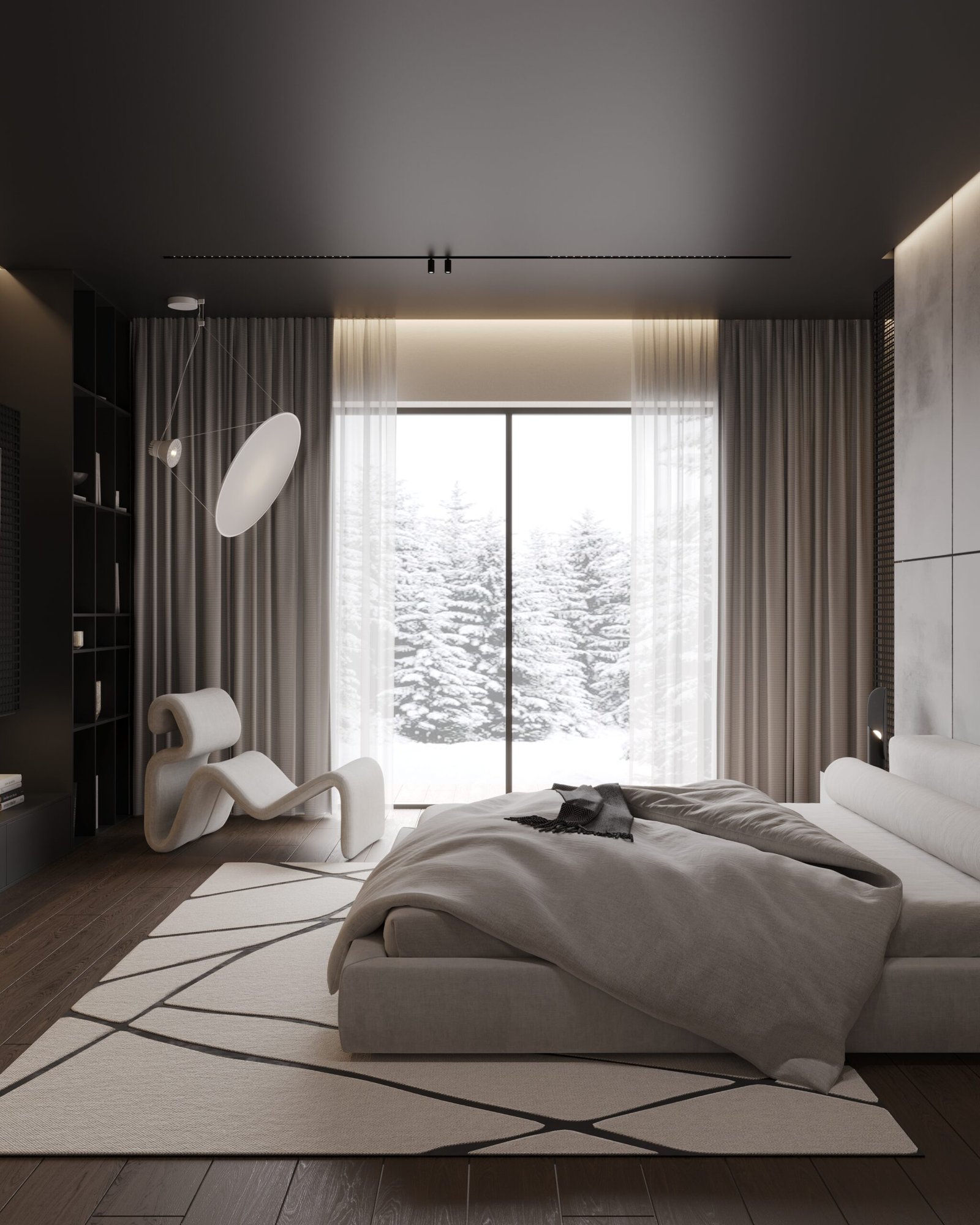 W tym projekcie postawiliśmy na ciemną, nastrojową paletę barw i surowe materiały. Beton architektoniczny na ścianach, stal nierdzewna oraz dominujące odcienie szarości tworzą spójną, minimalistyczną kompozycję. Charakter wnętrza podkreślają designerskie lampy i starannie dobrane dodatki, które wprowadzają nowoczesny akcent i subtelny luksus.